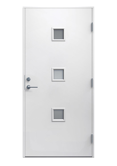 Melker är en modern ytterdörr med ett enkelt och rent uttryck. De tre fyrkantiga glasöppningarna sitter i rad och släpper in precis lagom med ljus. Tillräckligt för att kännas välkomnande, men ändå med insynsskydd. En dörr som passar i många olika hem, oavsett stil.