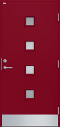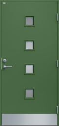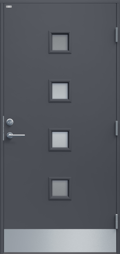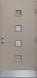 Ytterdörr i modern stil med slät yta utan dekor. Fyra små, kvadratiska klarglas och rostfri sparkplåt.